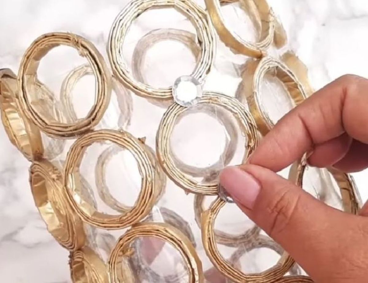 - Decora tu florero con los diamantes de imitación pegando uno en cada unión de los círculos. Y ¡listo! Disdruta de tu hermoso florero poniendo las flores que más te gusten.