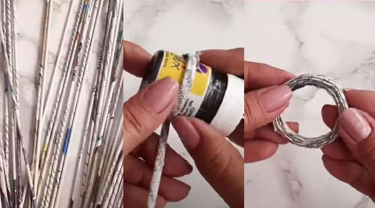 - Arma otras 30 tiras de periódico y píntalas de dorado. Luego, con ayuda de una botellita de pintura acrílica realiza 30 círculos con estas tiras como se ve en las imágenes de abajo. Píntalos de dorado y pégalos en la botella.