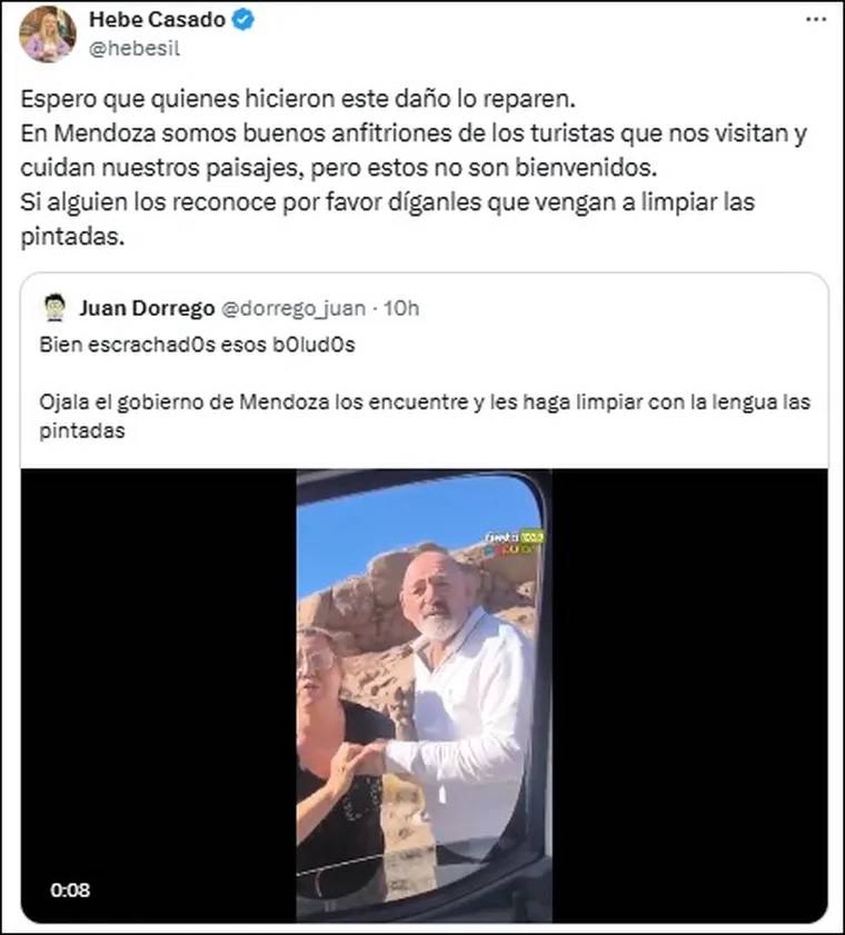 La vicegobernadora Hebe Casado se sumó al repudio generalizado a turistas que fueron filmados cuando vandalizaban rocas en Potrerillos. Con pintadas ensuciaron parte del paisaje natural de montaña, a la vera de la Ruta 7. Potrerillos es una de las principales atracciones turísticas de la provincia.