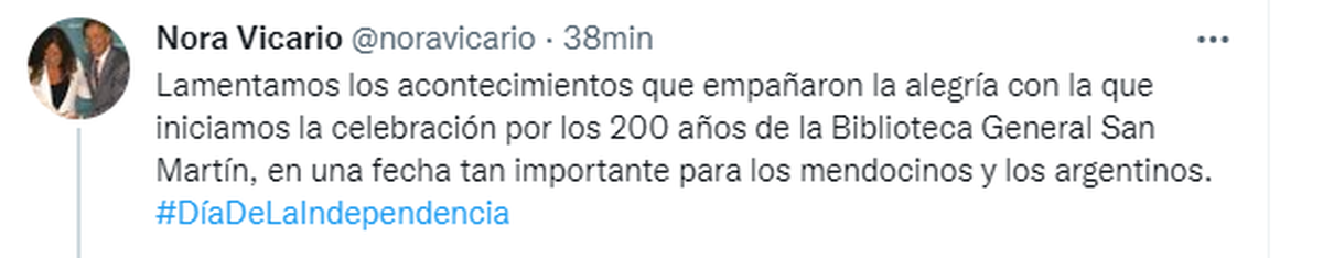 Por su parte, la ministra de Cultura y Turismo de Mendoza, Nora Vicario, lamentó lo ocurrido en sus redes: