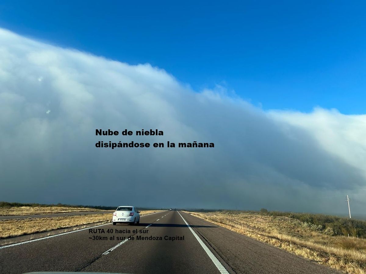 Esto puede haber ayudado a la formación de esta increíble nube rastrera al sur de la ciudad de Mendoza, sobre la ruta 40, llegando al límite sur del Valle de Uco.