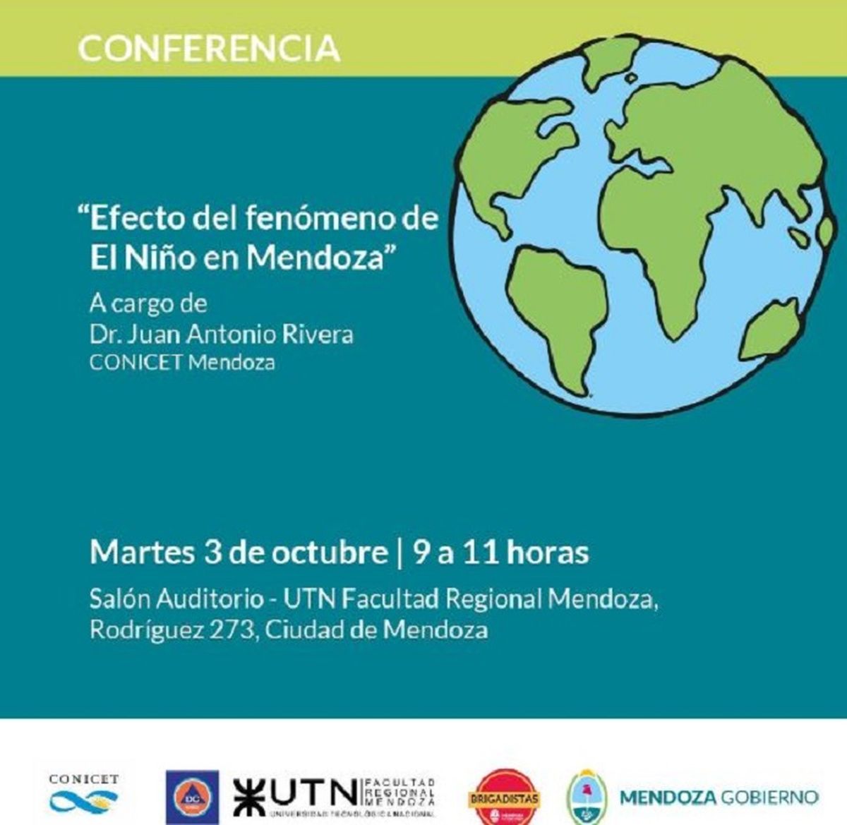 La conferencia “Efecto del fenómeno de El Niño en la provincia de Mendoza”, se realizará el día martes 03 de octubre 9 a 11 horas en el Salón de Actos de la Universidad, calle Rodríguez 273 de la Ciudad de Mendoza.