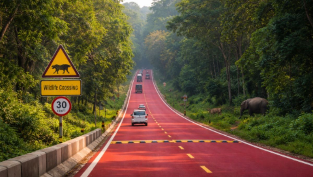 Para evitar atropellamientos y fragmentación del hábitat, se construyeron estructuras específicas como pasos elevados cubiertos de vegetación (ecoductos) y túneles subterráneos que permiten a especies como tigres, leopardos, ciervos y otros animales cruzar la ruta sin entrar en contacto con el tráfico.