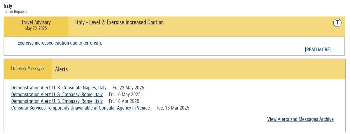 Estados Unidos emitió una nueva advertencia de viaje el 23 de mayo para ciudadanos que planean visitar Italia, manteniendo al país en el nivel dos de su sistema de alertas. Esta clasificación significa "ejercer mayor precaución" y coloca a la nación italiana en la misma categoría que Francia y Reino Unido.