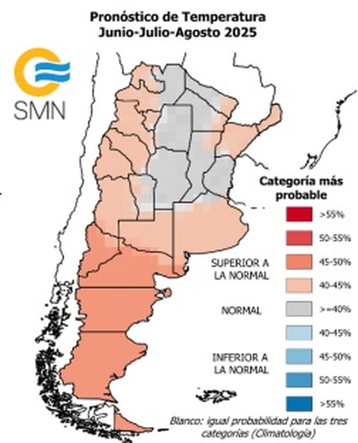 Según el SMN, en este invierno se esperan temperaturas superior a la normal en la región de Patagonia, normal o superior a la normal sobre el norte del Litoral, región del NOA, Cuyo, La Pampa y Buenos Aires y Normal sobre el este de Salta, centro-oeste de Chaco y Formosa, Santiago del Estero, Córdoba, este de San Luis y sur del Litoral.