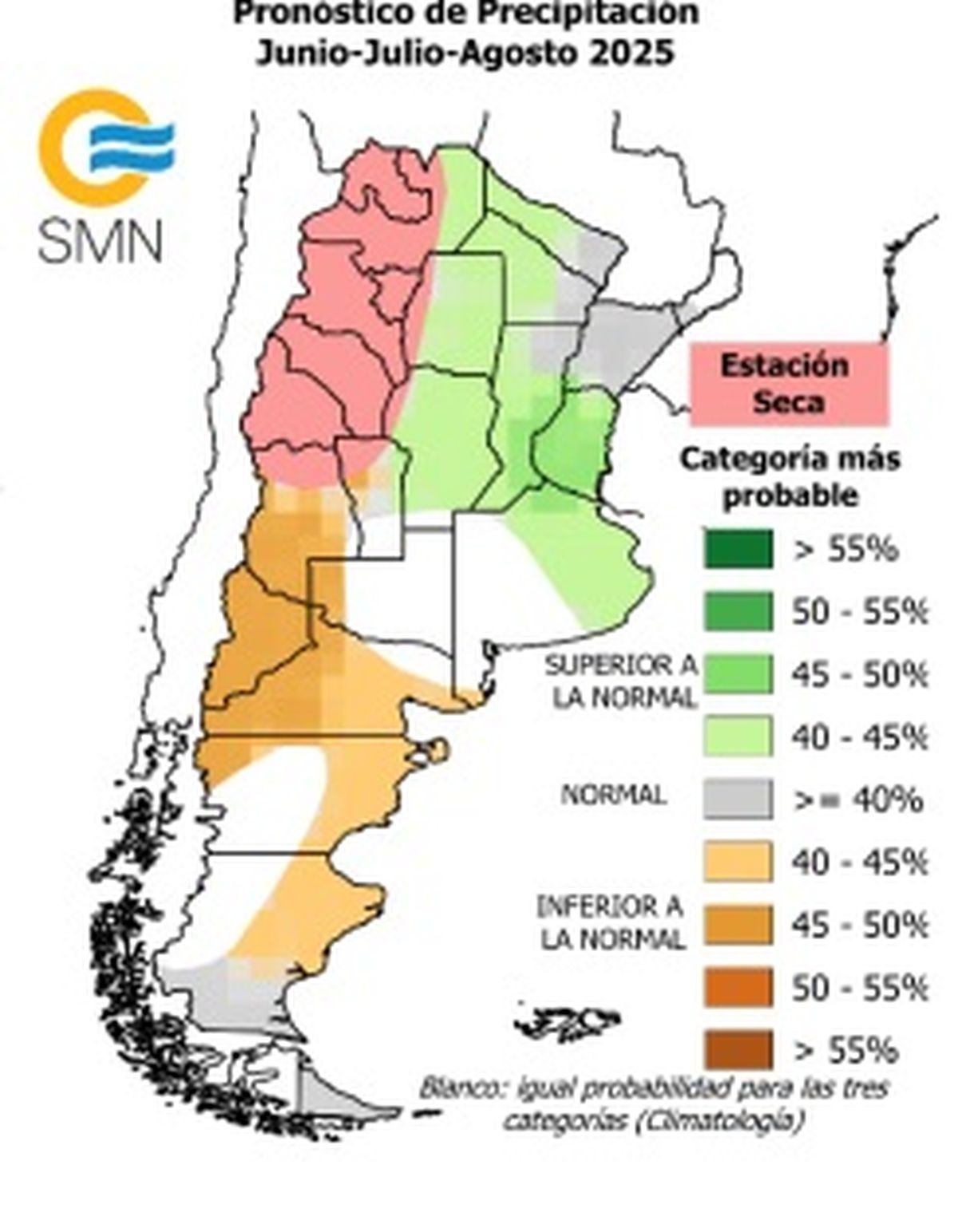 Según el SMN, en el invierno se prevé mayor probabilidad de ocurrencia de precipitación superior a la normal hacia el sur del Litoral, normal o superior a la normal en el este de Salta, centro-oeste de Formosa y Chaco, Santiago del Estero, oeste de Santa Fe, Córdoba, este de San luis y este de Buenos Aires.