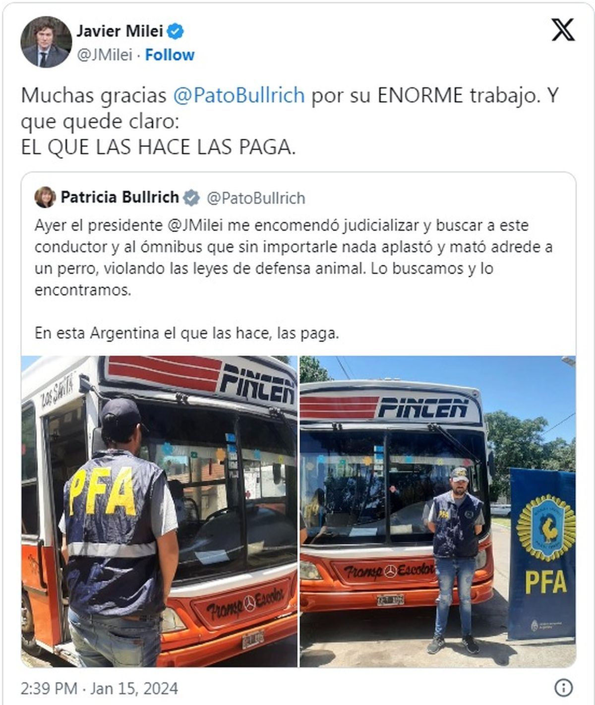 “Lo buscamos y lo encontramos. En esta Argentina el que las hace, las paga”, remató la titular de la cartera de Seguridad que recibió minutos después una respuesta de Milei: "Muchas gracias @PatoBullrich por su ENORME trabajo. Y que quede claro: EL QUE LAS HACE LAS PAGA".