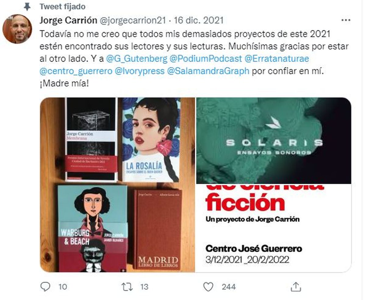 -Ok, pero en tu cuenta de Twitter hay un tuit fijado que dice, textualmente: “Todavía no me creo que todos mis demasiados proyectos de este 2021 estén encontrado sus lectores y sus lecturas. Muchísimas gracias por estar al otro lado”. Y ahí figuran tapas de distintos libros e, incluso, del podcast Solaris. La cosa no ha parado desde entonces.