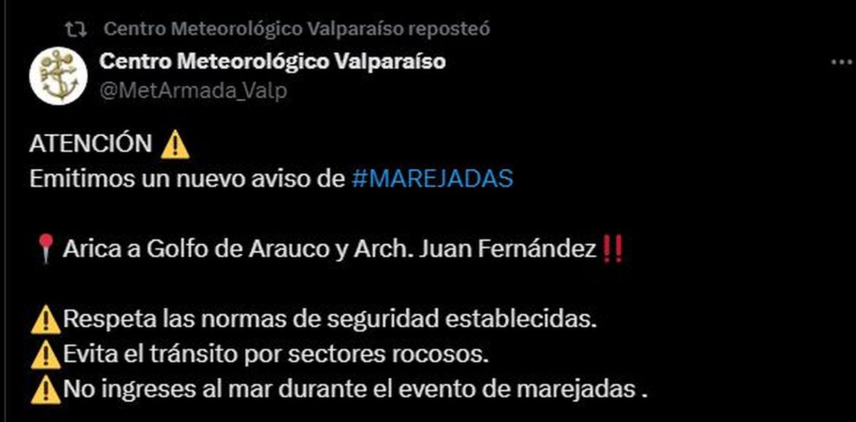 Al mismo tiempo desde el Centro Meteorológico de Valparaíso se avisó que el alerta es válido desde Arica y Parinacota hasta el Golfo de Arauco en el Biobío. Incluye al Archipiélago de Juan Fernández.