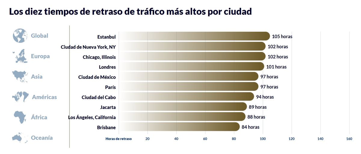La metrópolis turca que tiene 16 millones de habitantes, ocupa el puesto número 1 del ranking, con un promedio de 105 horas perdidas anualmente por cada automovilista, un 15% más que en 2023 y un 38% más que en 2022. Luego, le siguen la ciudad de Nueva York y Chicago Illinois, ocupando el segundo y tercer puesto con 102 horas perdidas en congestiones de tráfico en carreteras. Volviendo a Europa, Londres queda en el cuarto puesto con 101 horas perdidas anualmente, y Ciudad de México en quinto puesto con 97 horas.