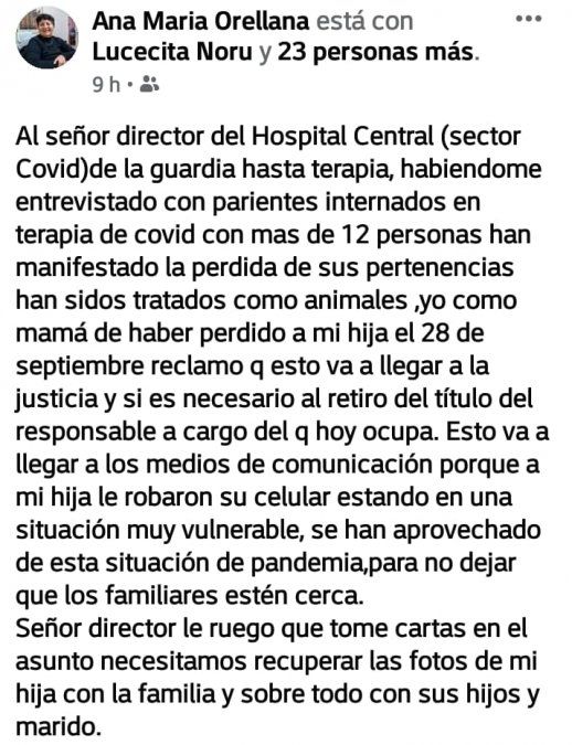 Samanta ingresó al Hospital Central por coronavirus, allí logra recuperarse pero, al padecer una enfermedad de base, debe quedar internada. "El lunes 14 fue la última vez que hablamos con ella. El 15 nos avisa que la van a pasar a terapia intensiva pero del sector del hospital donde están el resto de los pacientes porque ya había logrado superar el coronavirus", detalla Romina que, en medio del dolor, intenta recuperar las pertenencias de su hermana.