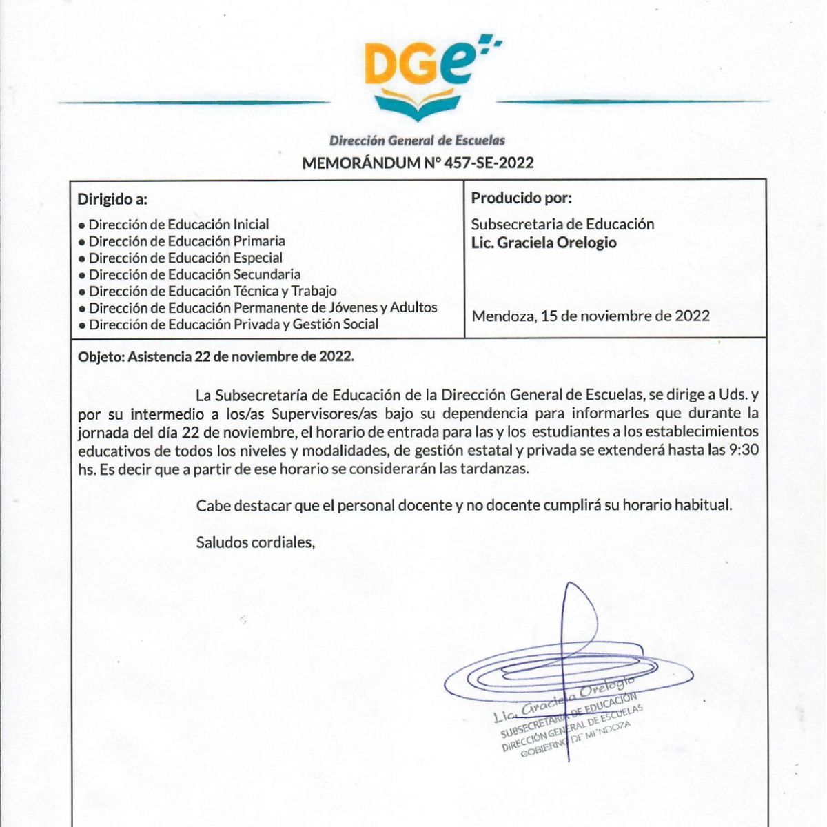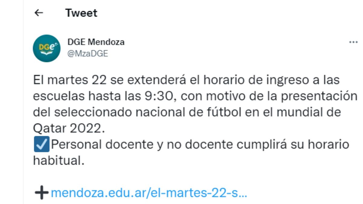 Una publicación oficial de la DGE, fechada este martes, expresa: "Con motivo de la presentación del seleccionado nacional de fútbol en el Mundial de Qatar 2022, la Dirección General de Escuelas informa que durante la jornada del 22 de noviembre, el horario de entrada para las y los estudiantes a los establecimientos educativos de todos los niveles y modalidades, de gestión estatal y privada, se extenderá hasta las 9.30. A partir de ese horario, se considerarán las tardanzas".