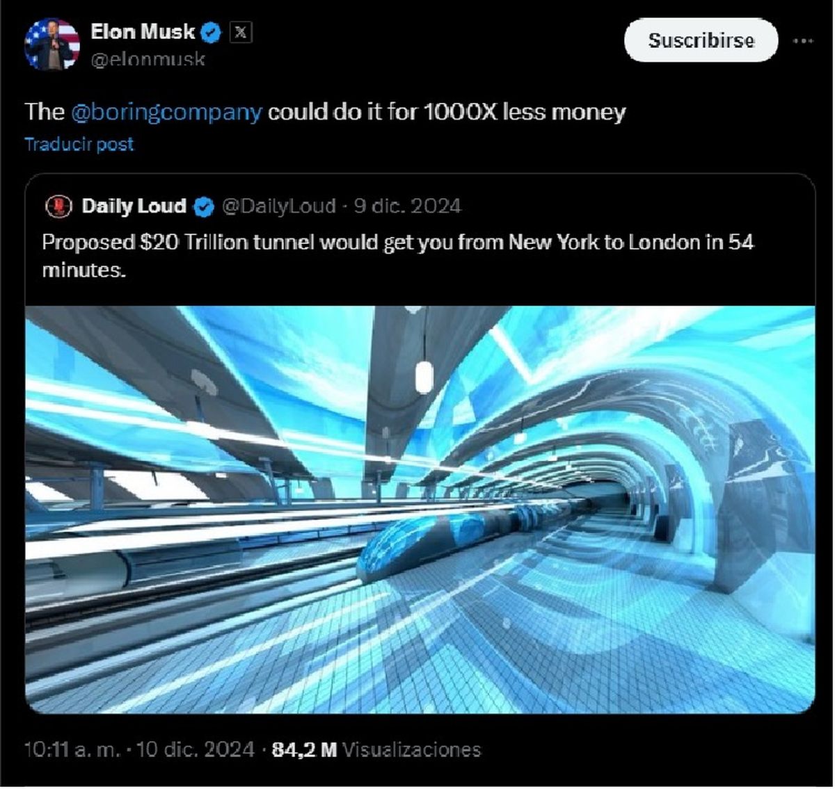 En las redes sociales, Elon Musk expresó su interés por el proyecto del túnel transatlántico. Publicó en su cuenta de X: "Boring Company podría hacerlo por 1.000 veces menos dinero". Este proyecto del túnel tenía estimado un costo de 20 mil millones de dólares.