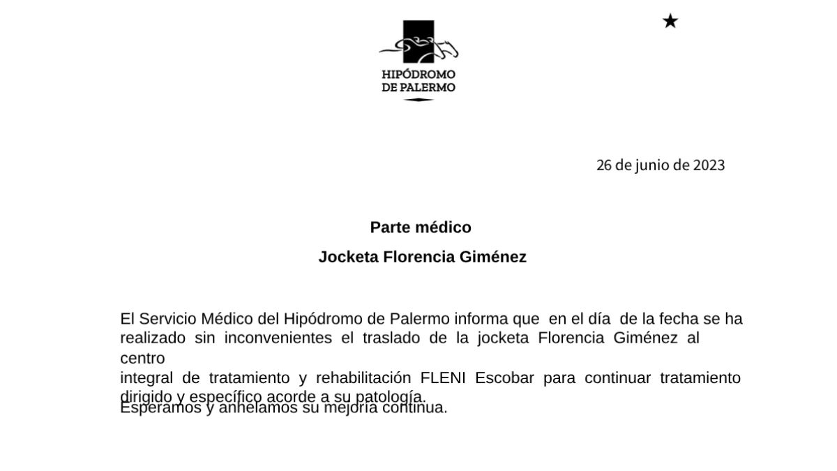 A poco días de un parte del servicio médico de la actividad hípica del Hipódromo Argentino de Palermo, donde se consignaba un avance en el estado neurológico de la mendocina de 27 años, este lunes por la tarde fue dado a conocer otro, que informó sobre el traslado de Florencia al centro de rehabilitación Fleni , en su sede el el partido de Escobar, en la provincia de Buenos Aires.