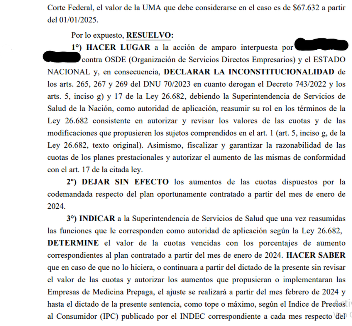 En los fundamentos de la sentencia, dictada con fecha 21 de abril, el juez de primera instancia del Juzgado Federal Nº 2 de Mendoza rechazó los aumentos aplicados por la empresa de medicina prepaga por considerar que fueron desmesurados y resolvió la inconstitucionalidad de los artículos 265, 266 y 267 del decreto 70/2023 mediante el cual, entre otras cosas, el Estado nacional derogó las funciones de contralor de la Superintendencia de Servicios de Salud que provocaron el aumento de las cuotas a cargo de los afiliados.