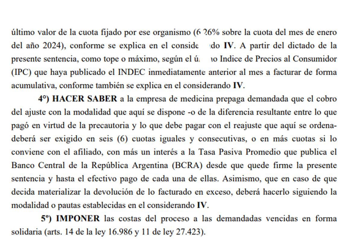 La sentencia dispone también que en el caso que la Superintendencia no determine los aumentos, debe aplicarse como tope máximo lo que establezca el Índice de Precios al Consumidor (IPC) publicado por el INDEC.