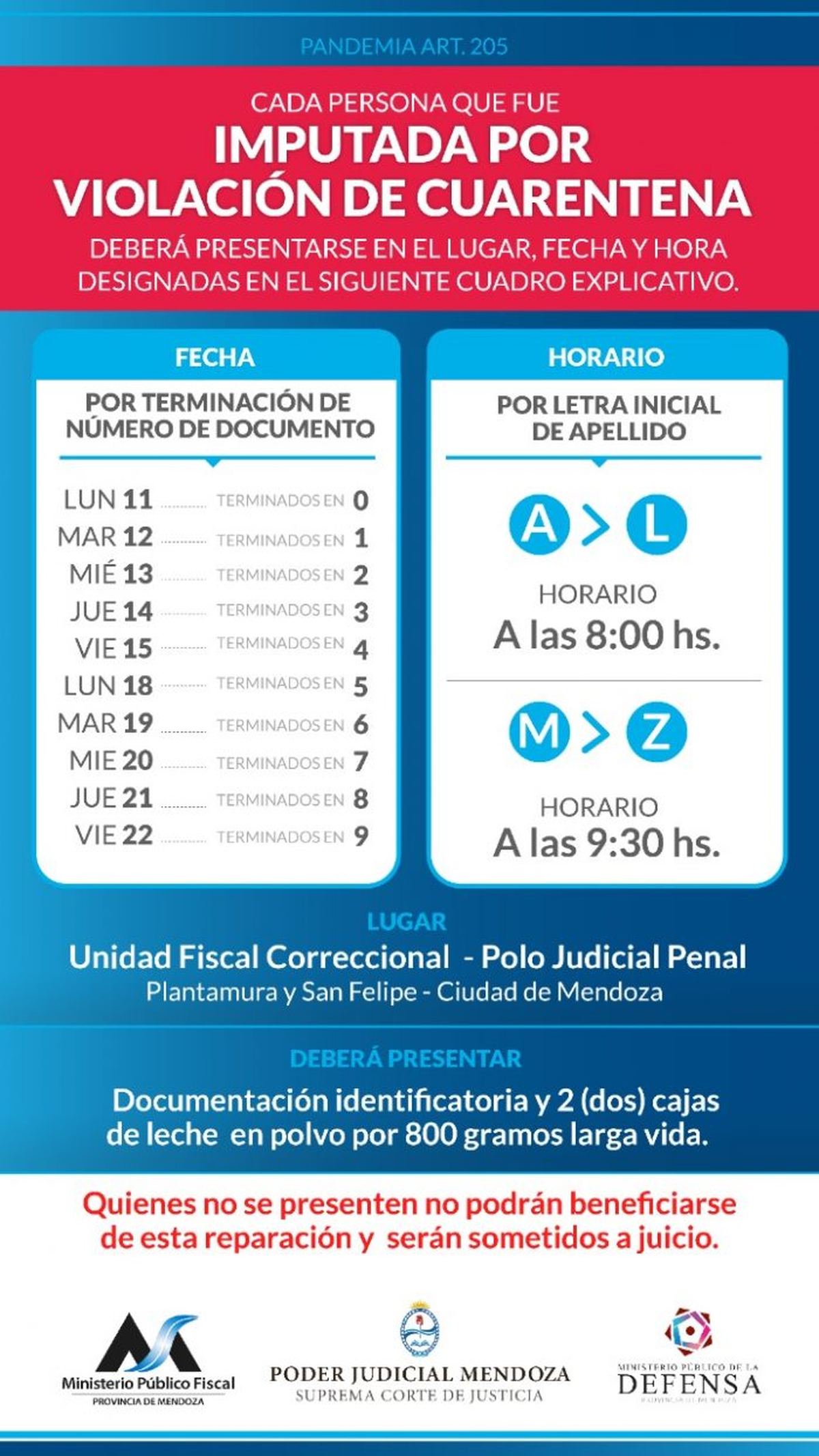 Más de 6.000 ciudadanos fueron imputados por la violación del artículo 205. Frente a la enorme cantidad de causas judiciales abiertas y a la imposibilidad operativa de tratarlas una por una, la Justicia ofreció una solución restaurativa: que cada imputado pague por el daño ocasionado donando cajas de leche. Todo lo recaudado será destinado a las carteras de Salud y Educación de Mendoza.