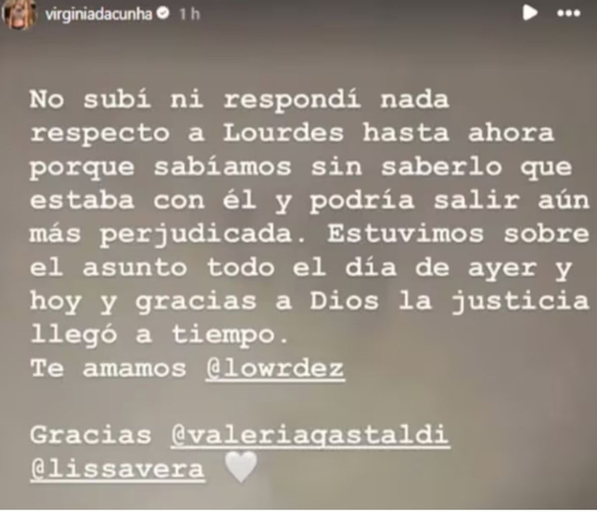 Por su parte, Virginia Dacunha, otra de las ex Bandana se expresó a través de instagram y cargó contra García Gómez. "No subí ni respondí nada... porque sabíamos sin saberlo que (Lourdes) estaba con él y podría salir más perjudicada.