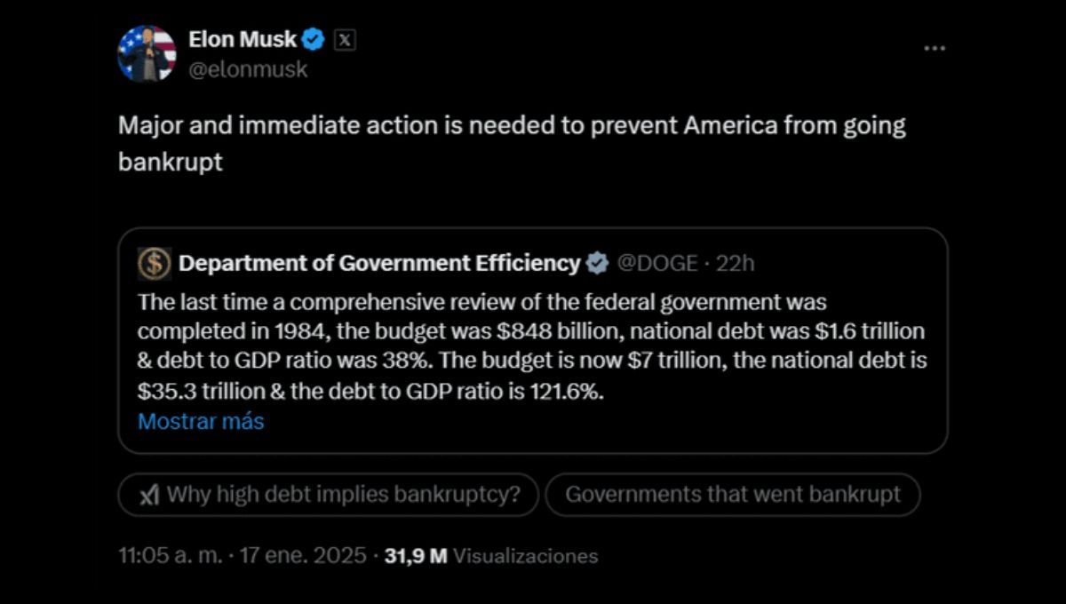 Elon Musk advirtió que el rápido aumento de la deuda podría poner en riesgo la estabilidad financiera de Estados Unidos, a menos que se tomen medidas "urgentes y decisivas". La deuda creciente y el gasto descontrolado, de esta economía referente en el mundo, no solo amenazan la estabilidad económica de Estados Unidos, sino también la capacidad de financiar programas esenciales.