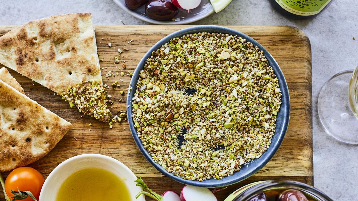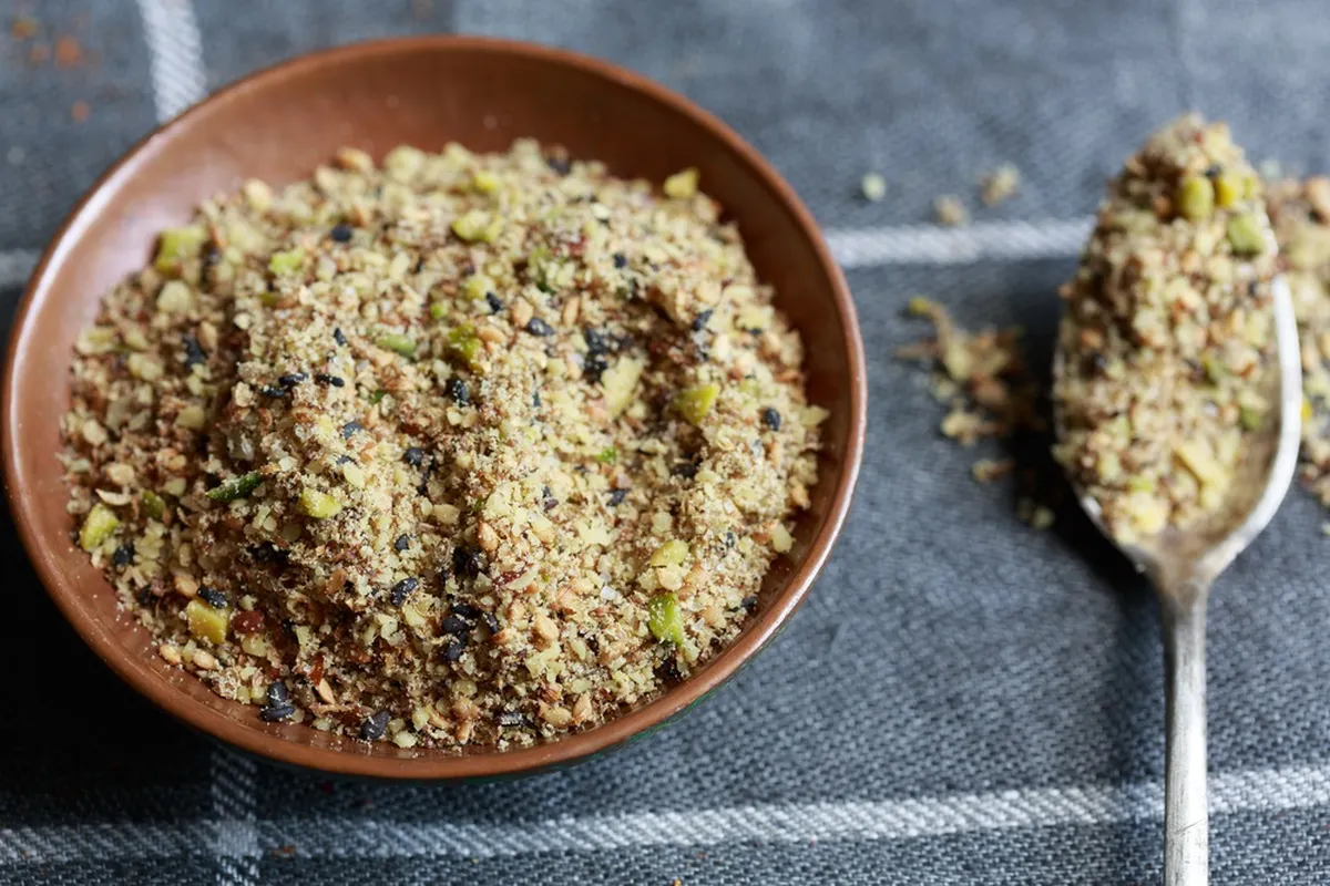 Se trata del Dukkah una mezcla de frutos secos, semillas, especias y hierbas típicas de la gastronomía de la zona de Egipto. Tradicionalmente, se ha utilizado para elaborar salsas para añadir al pan de pita, aunque también se usa como condimento de ensaladas, pescados, mariscos y carnes.
