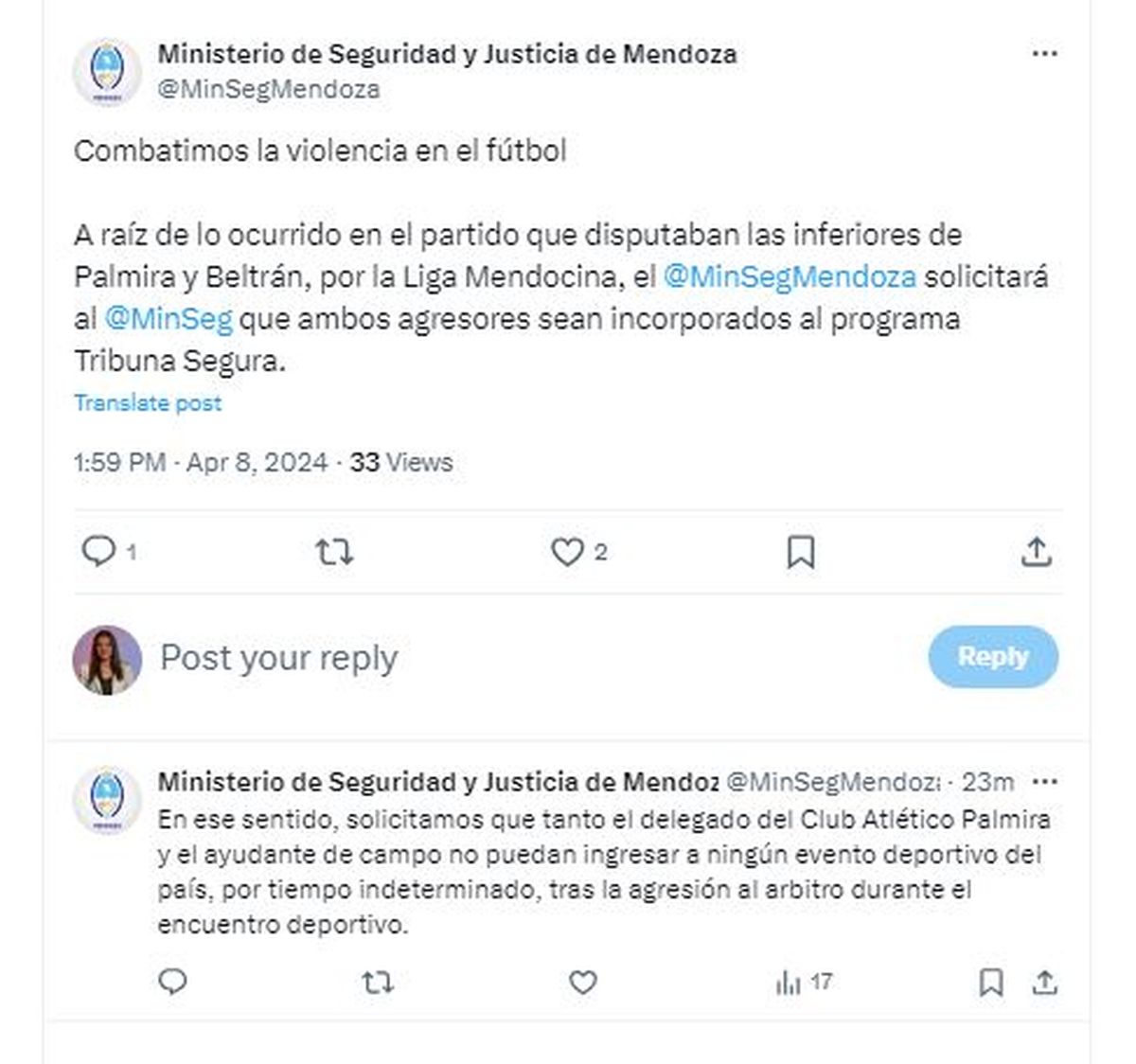 Germán Malovini, representante de la asociación que nuclea a los árbitros de fútbol mendocino, relató lo sucedido en diálogo con Canal 7. "Cristian Miranda y Damián Ojeda terminaron en el hospital, están bien aunque anímicamente muy mal; quisieron hacer la denuncia en la fiscalía pero como no hay fiscalía en Beltrán tuvieron que ir hoy (por este lunes) a la mañana a Rodeo del Medio", contó Malovini en referencia al estado de salud de ambos árbitros y la derivación policial que generó la agresión.