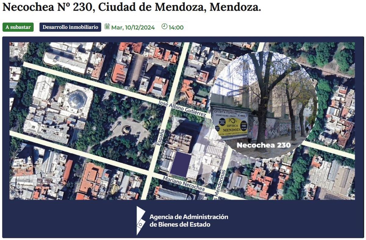 La Agencia de Administración de Bienes del Estado puso a la venta una de las propiedades que tiene en el centro de Mendoza, para lo que convocó a subasta pública a quienes deseen quedarse con la propiedad ubicada a media cuadra de la plaza San Martín. El terreno se sitúa entre el Banco Galicia y el Club de Gimnasia y Esgrima.