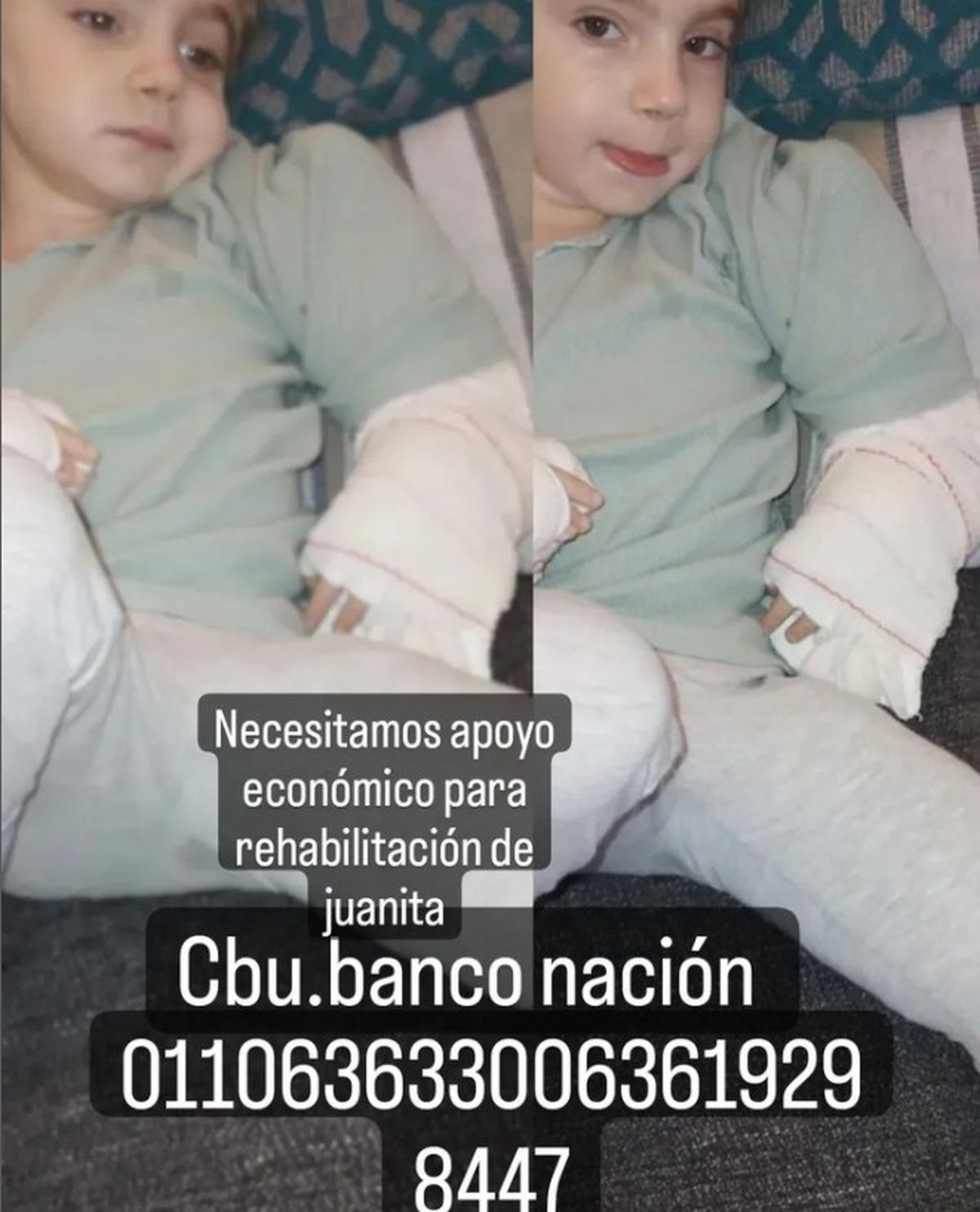 El papá de Juanita destacó que le ofrecieron dos alternativas en la clínica. "Una opción era girar el cúbito y dejarlo así, que es lo que hicimos. La otra posibilidad era sacar un dedito del pie y usar ese hueso para hacer otro injerto, y como ya le habían abierto el bracito, había que sacar tendones de más arriba, abrir a la altura del hombro, y decidimos que no, porque ya va a quedar con muchas cicatrices, a pasar de nuevo todo el proceso, y se podía volver a infectar".