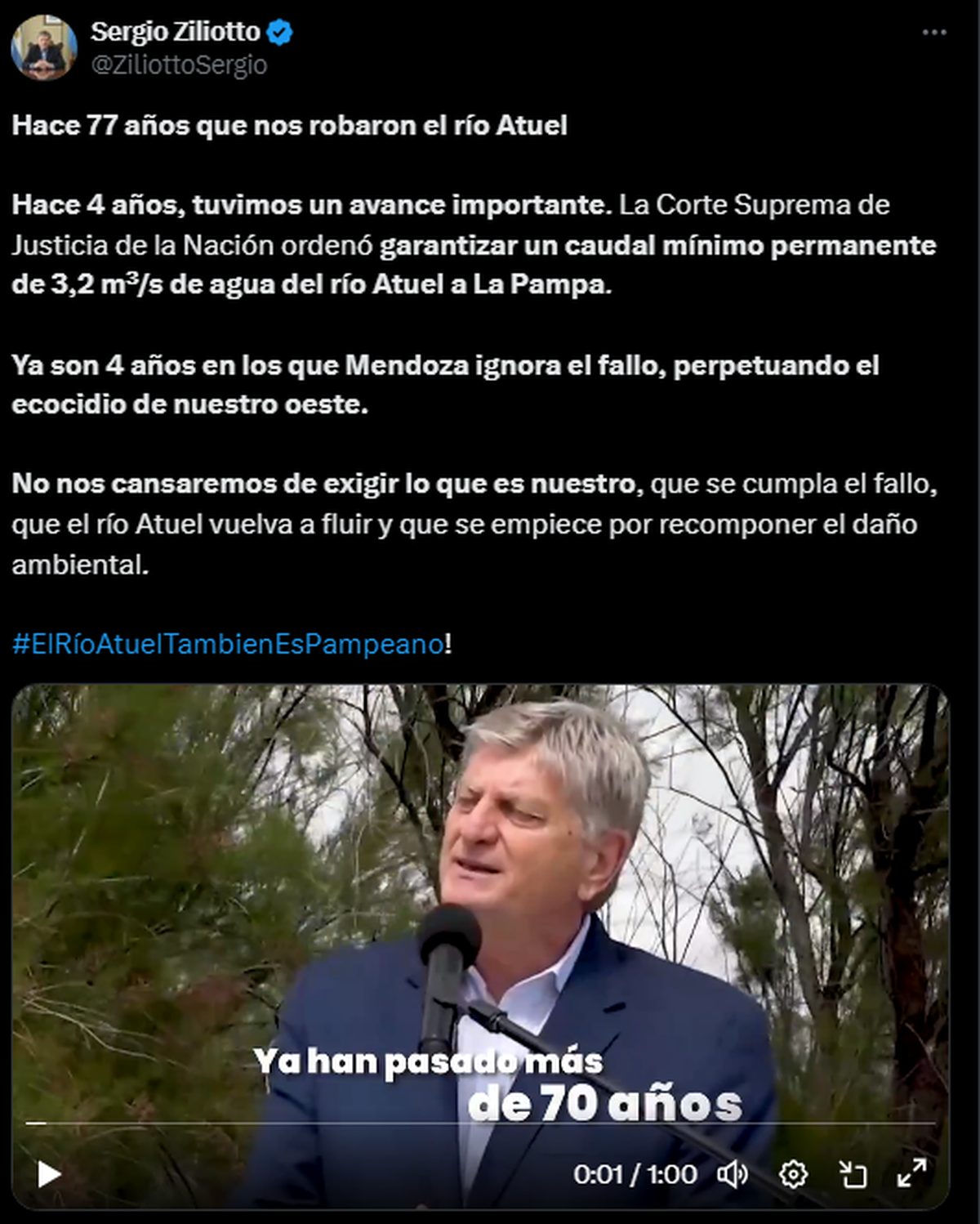 Sergio Ziliotto, gobernador de La Pampa, criticó a Mendoza en el cuarto aniversario del fallo de la Corte Suprema de la Nación que ordenó garantizar un caudal mínimo de 3,2 m³/s de agua del río Atuel a La Pampa. "Ya son 4 años en los que Mendoza ignora el fallo, perpetuando el ecocidio de nuestro oeste", publicó en X.