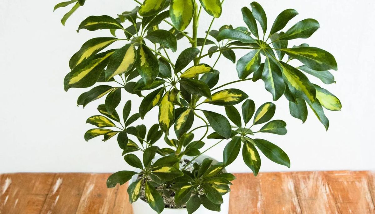 La schefflera, también conocida como planta paraguas, es una de las variedades más conocidas para añadir en el hogar. Se trata de una especie de interior con hojas verdes y, en ocasiones amarillas, que crece hacia lo alto a modo de pequeño árbol. Tolera muy bien la escasez de agua y purifica el aire.