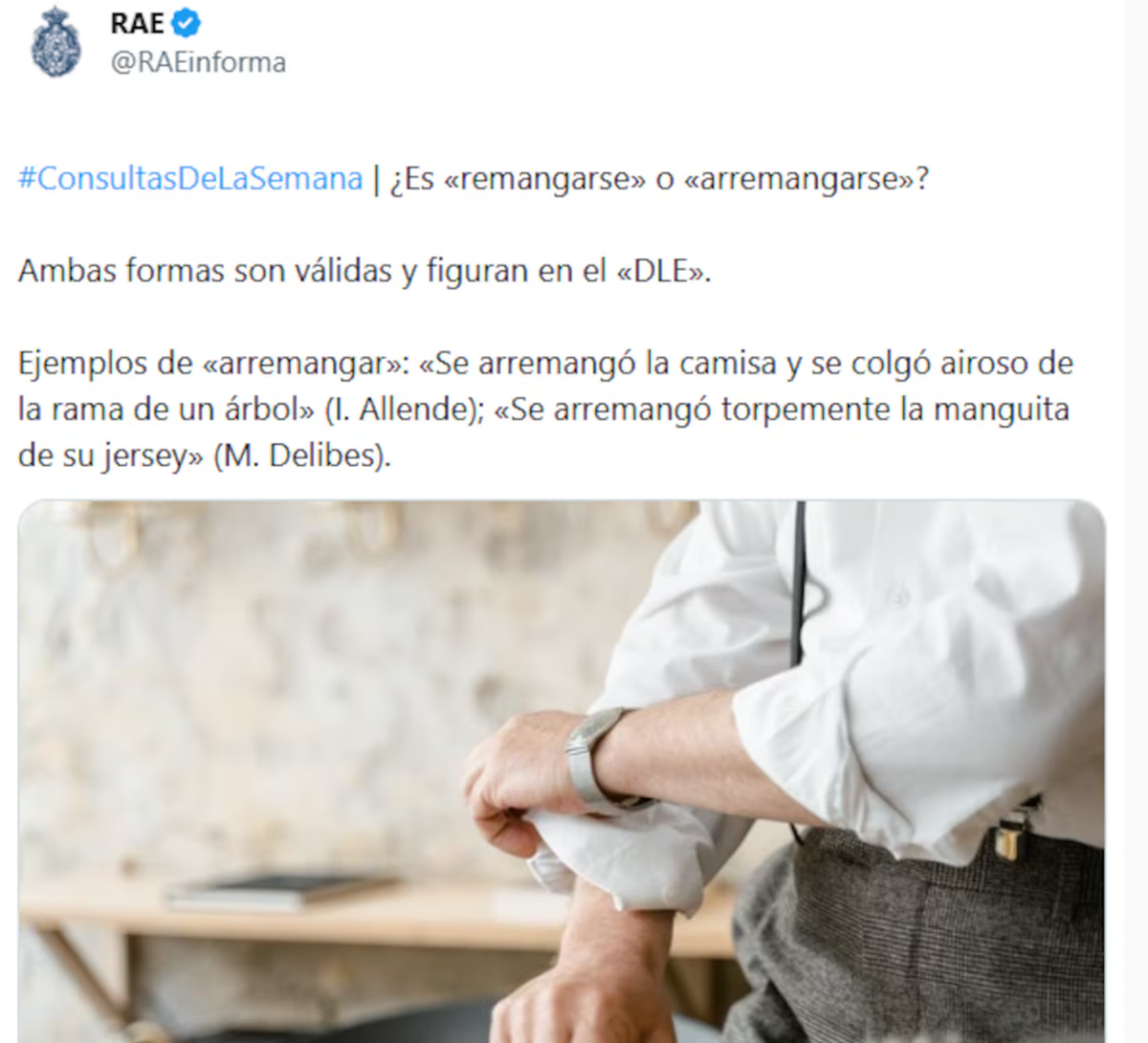 La Real Academia Española despejó las dudas de cuál es el término indicado para referirse al acto de levantar o recoger las mangas -de las camisas generalmente- para arriba para estar más cómodo. "Remangarse" o "arremangarse", cuál es la adecuada.