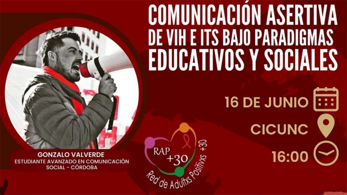 La Red de Adultos Positivos +30 (Rap+30) invita a participar taller en "Comunicación Asertiva de VIH e ITS bajo Paradigmas Educativos y Sociales" que se desarrollará el día 16 de junio a las 16 en el CICUNC.
