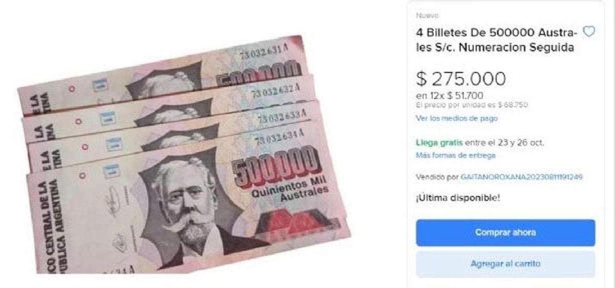 Por caso, una persona publicó la venta de "4 billetes de 500.000 australes S/c. Numeración seguida" y pide por ellos la suma de 275.000 pesos.