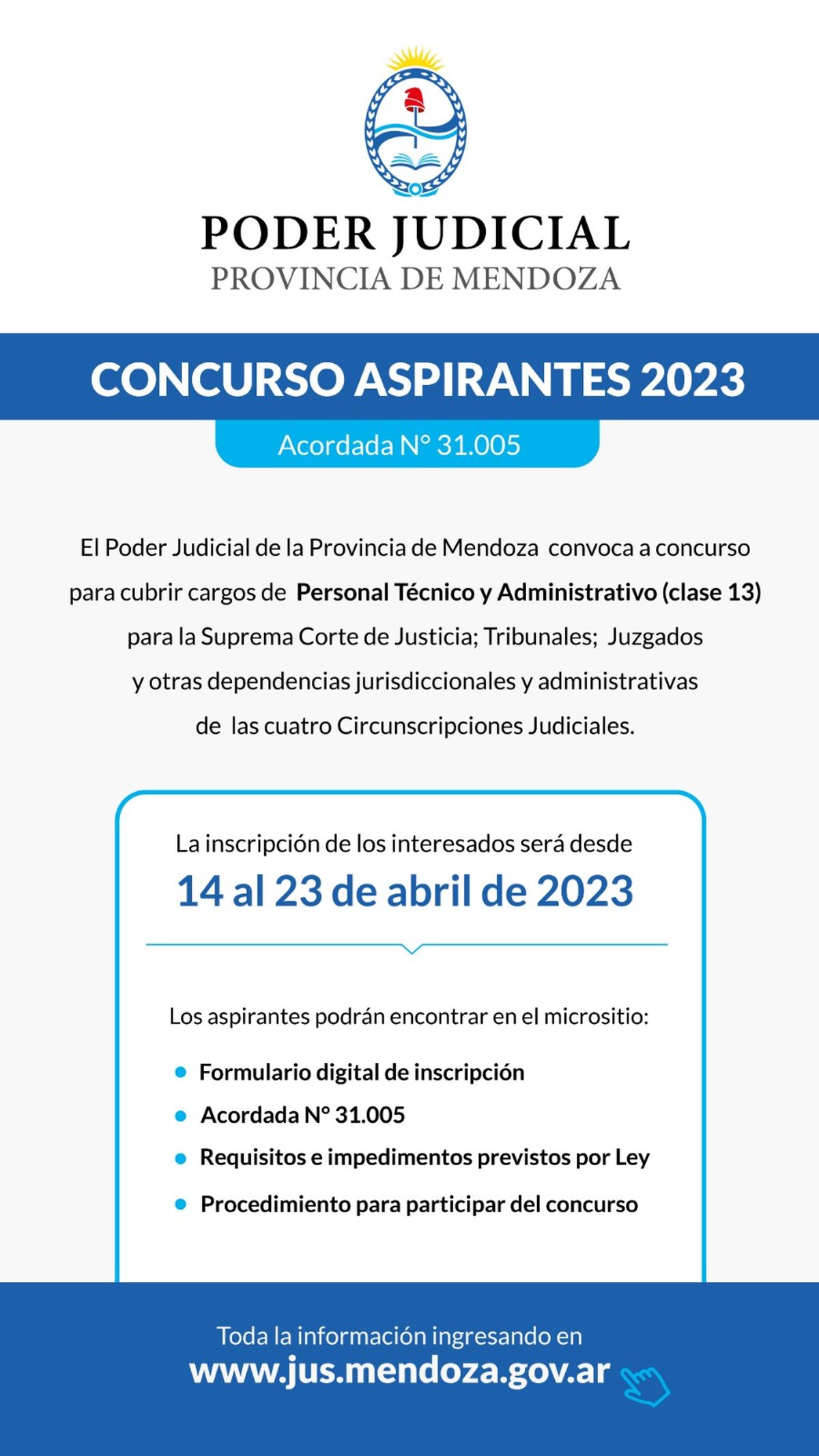 En los argumentos de la convocatoria se indica que obedece a "la necesidad de contar con una nómina de aspirantes aprobados que permita Ia cobertura de las vacantes de los cargos de nivel inicial del escalafón de la Suprema Corte de Justicia de Mendoza, que se originen en los distintos tribunales, juzgados y demás dependencias administrativas y de apoyo del servicio de justicia".