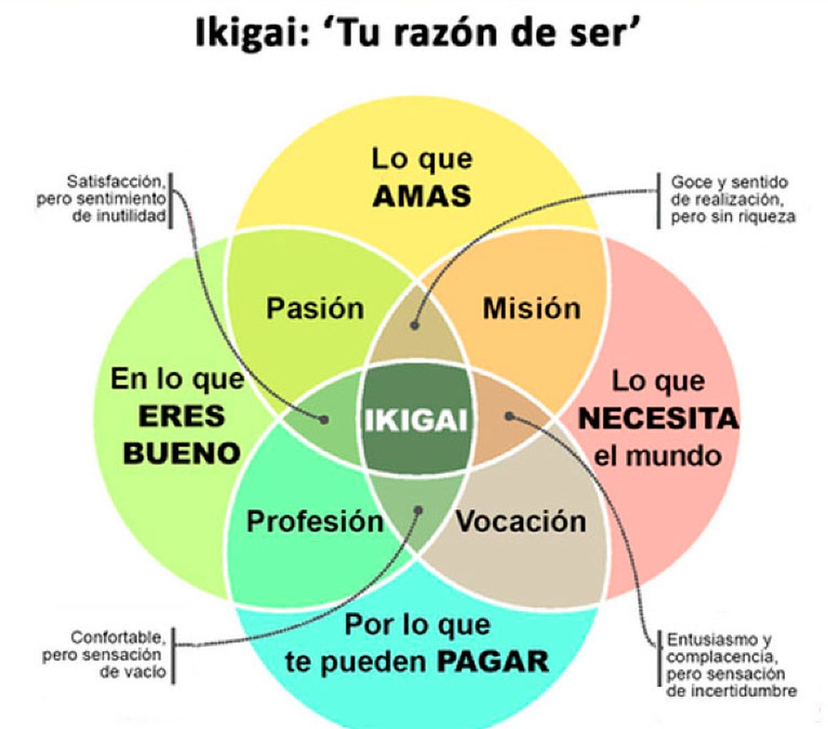 La técnica japonesa el ikigai se suele representar gráficamente como un diagrama de Venn donde se cruzan la pasión, misión, vocación y profesión.