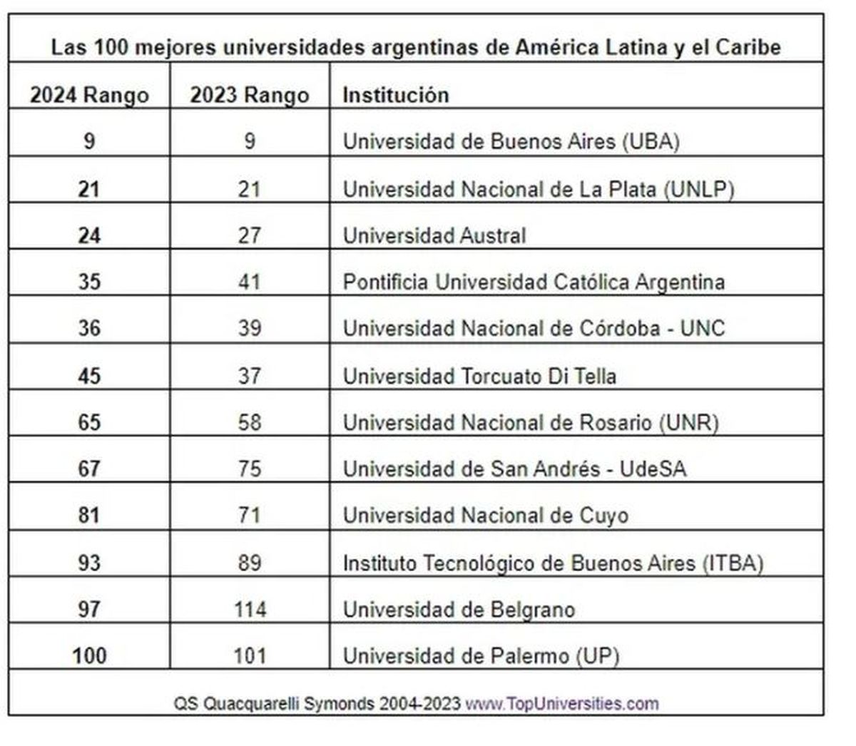 Es para destacar además que dentro de las 12 universidades situadas entre las 100 mejores, 5 son públicas: UBA, UNLP, UNC, UNR y UNCuyo.