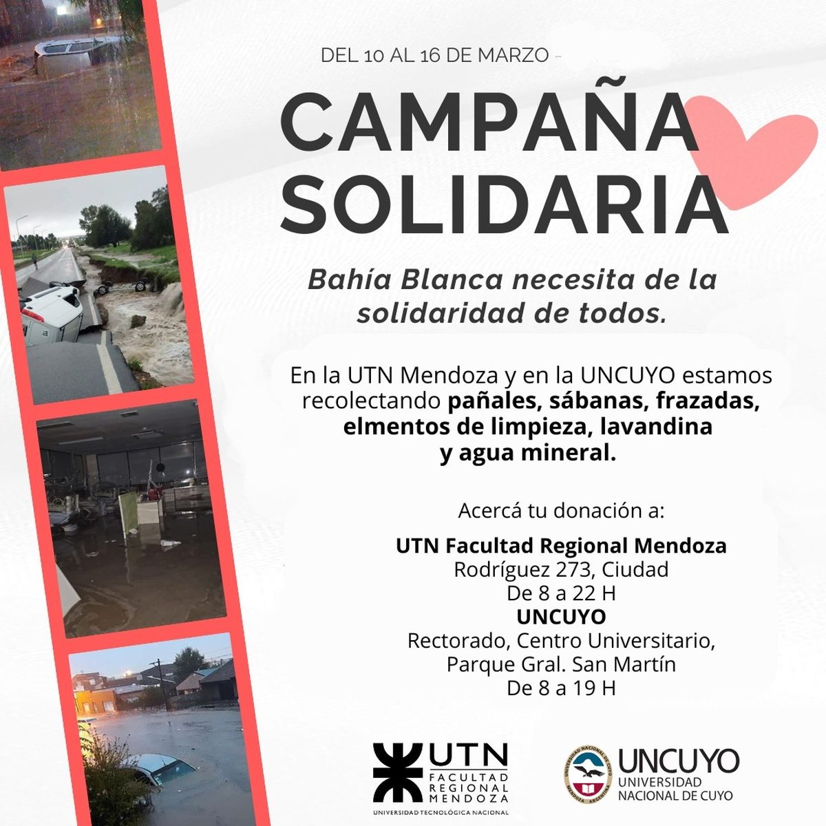 Frente a la urgencia de miles de familias que lo perdieron todo, la Universidad Nacional de Cuyo (UNCuyo) y la Universidad Tecnológica Nacional (UNCuyo) se unieron en una cruzada solidaria para recolectar elementos de higiene y de abrigo. La misma se extenderá desde este lunes al 16 de marzo.