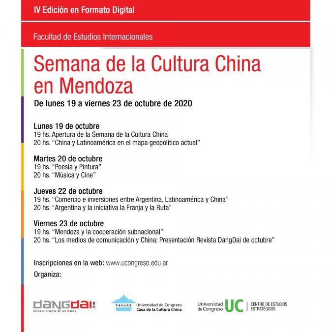 Desde la Facultad de Estudios Internacionales y el Centro de Estudios Estratégicos, en colaboración con la revista DangDai y la Casa de la Cultura China en Argentina, organizan una nueva edición de la Semana de la Cultura China en Mendoza. La IV Edición será en formato digital, contará con paneles a través de la plataforma Zoom, con exponentes de distintos puntos del mundo.