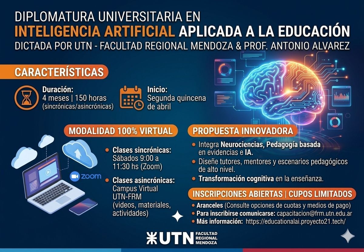 Esta instancia de formación de la UTN está diseñada para proporcionar a docentes, estudiantes de profesorado, autoridades educativas y directivos de instituciones educativas una formación integral en el uso y aplicación de la inteligencia artificial (IA) en el ámbito de la educación.