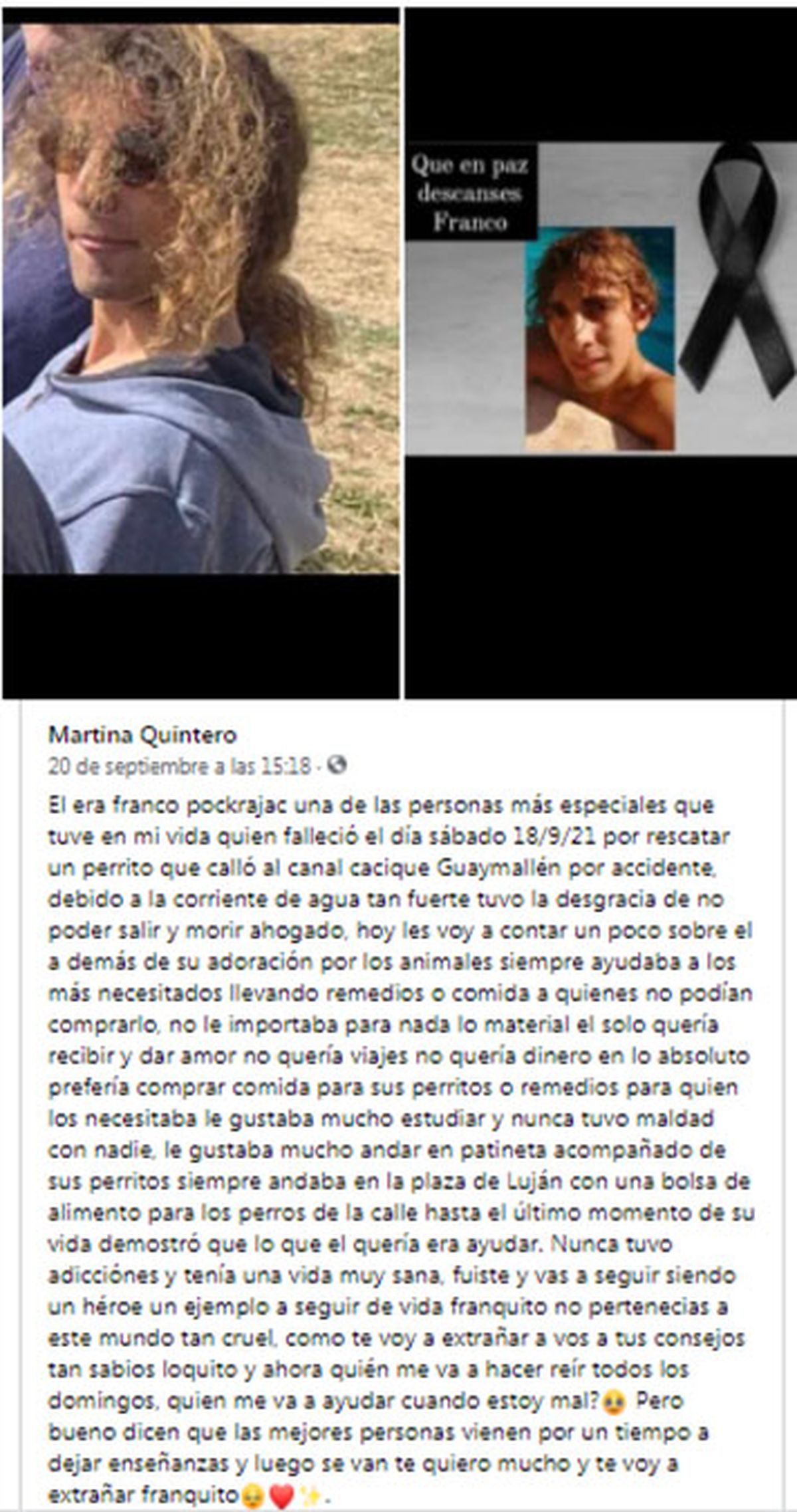"El era Franco Pockrajac una de las personas más especiales que tuve en mi vida quien falleció el día sábado 18/9/21 por rescatar un perrito que calló al canal cacique Guaymallén por accidente, debido a la corriente de agua tan fuerte tuvo la desgracia de no poder salir y morir ahogado", añade Martina Quintero en un posteo en Facebook.