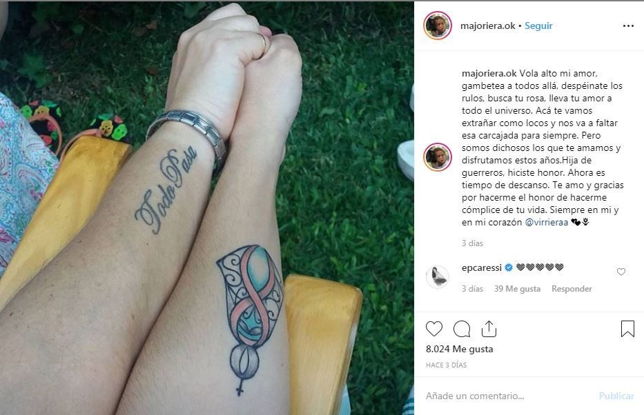 "Volá alto, mi amor. Gambeteá a todos allá, despeinate los rulos, buscá tu rosa, llevá tu amor a todo el universo. Acá te vamos extrañar como locos y nos va a faltar esa carcajada para siempre. Pero somos dichosos los que te amamos y disfrutamos estos años. Hija de guerreros, hiciste honor. Ahora es tiempo de descanso. Te amo y gracias por hacerme el honor de hacerme cómplice de tu vida. Siempre en mí y en mi corazón, @virrieraa", Majo.