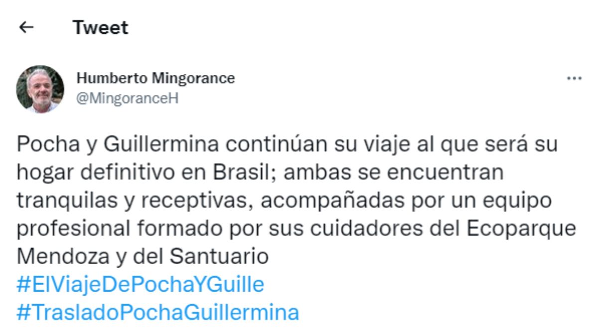 "Pocha y Guillermina continúan su viaje al que será su hogar definitivo en Brasil; ambas se encuentran tranquilas y receptivas, acompañadas por un equipo profesional formado por sus cuidadores del Ecoparque Mendoza y del Santuario" informó desde la red del pajarito el funcionario provincial.
