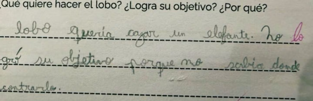 Según comentó el padre del alumno, la consigna consistía en describir qué quería hacer un lobo y detallar si pudo lograr su objetivo. En consecuencia, el niño escribió en su cuaderno: “El lobo quería cazar un elefante. No logró su objetivo porque no sabía dónde encontrarlo”.