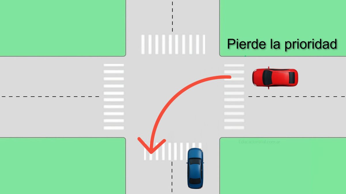 Caso 1: si un auto se aproxima a una intersección y su conductor observa al vehículo que circula a su derecha que ha encendido su señal de giro, entonces debe saber que quien viene por la derecha está perdiendo la prioridad de paso. Le corresponde al que circula por la izquierda continuar su marcha recta, es decir que tiene la prioridad de paso quien circula por izquierda.