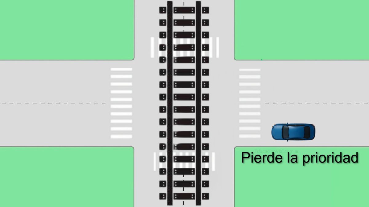 Caso 3: los vehículos vinculados al transporte ferroviario (trenes o metrotranvía) tienen prioridad de paso. Al aproximarse a una vía férrea, el automotor a pesar de estar circulando por la derecha, debe detenerse y observar que no venga ningún tren antes de continuar.
