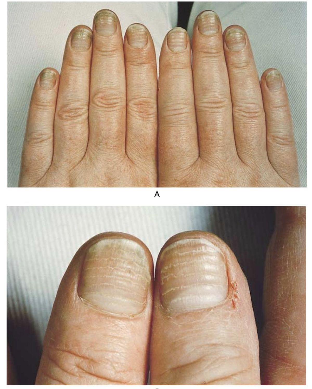 Además, pueden presentarse en un individuo por cualquier causa de las ya conocidas que inhiba el crecimiento de la matriz por un período de 1 a 2 semanas o más, afectando una, varias, o todas las uñas de manos o pies.