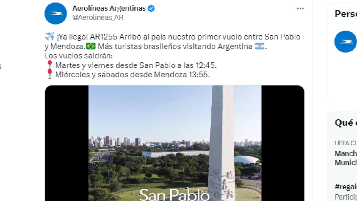 Este martes se produjo un hito importante para la conectividad aérea de Mendoza, con la llegada del primer vuelo de la empresa estatal Aerolíneas Argentinas entre la ciudad brasileña de San Pablo y el aeropuerto El Plumerillo de nuestra provincia. Se inauguró así una ruta inédita para la línea de bandera, ya que nunca había volado en forma regular entre estos dos destinos.