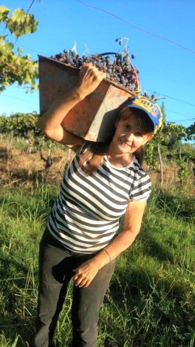 Ahí va Esther, con el tacho al hombro, con la piel pringosa de mosto, con la sonrisa franca. Ella, sus hermanas, sus hijos, sus sobrinos, sus nietos, sus amigos. Su madre, que mira a todos por debajo de la capelina, es Nélida Urbieta de Basles, que con sus 74 años ha dicho "que la tradición de la cosecha no se pierda" y, como todos los marzos, ha ordenado agarrar las tijeras, los tachos y cargar el camión.