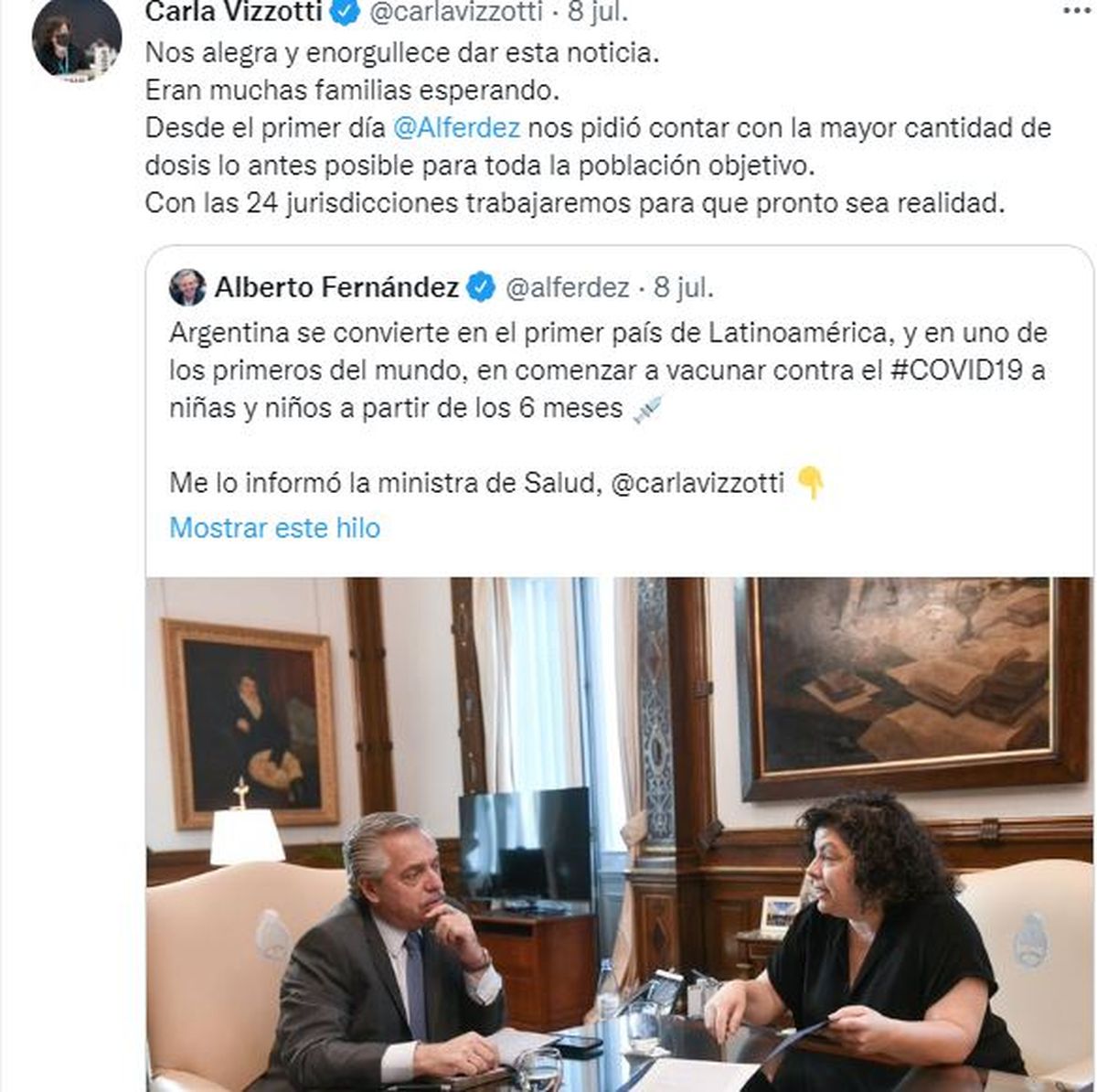 La ministra de Salud, Carla Vizzotti, anunció miércoles que el viernes a la mañana llegará al país una primera entrega de 2,7 millones de vacunas contra el Covid para iniciar el esquema para los niños y niñas a partir de 6 meses.