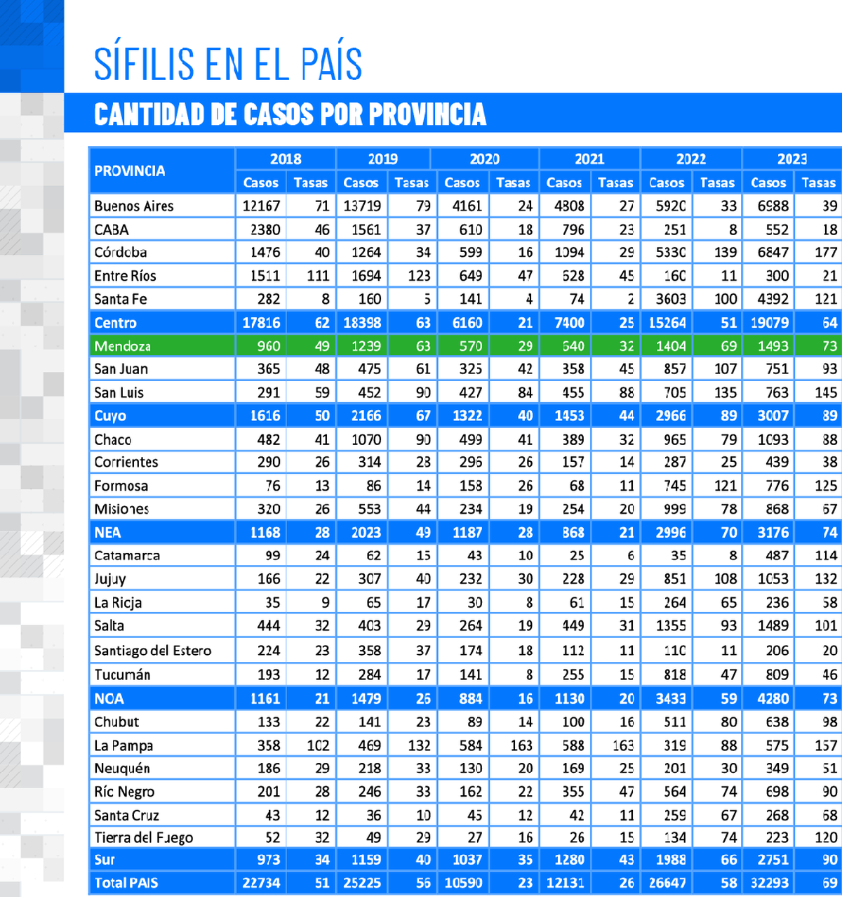 En la provincia, mientras en el 2018 se registraron 960 casos nuevos de sífilis, en 2023 el número trepó a 1.493. Dejando fuera los años de pandemia (2020 y 2021) en donde hubo pocos casos registrados, en el resto de los periodos la cifra siempre fue en aumento.
