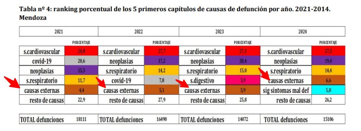 Las causas externas, que no se vinculan directamente con enfermedades, tienen un peso importante en la opinión pública y la gestión, aunque dentro del marco general representan una parte menor de los fallecimientos, como muestra este cuadro: